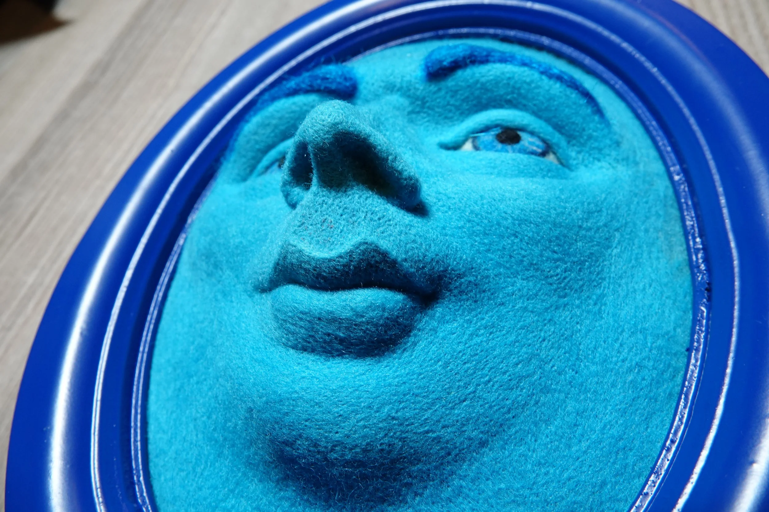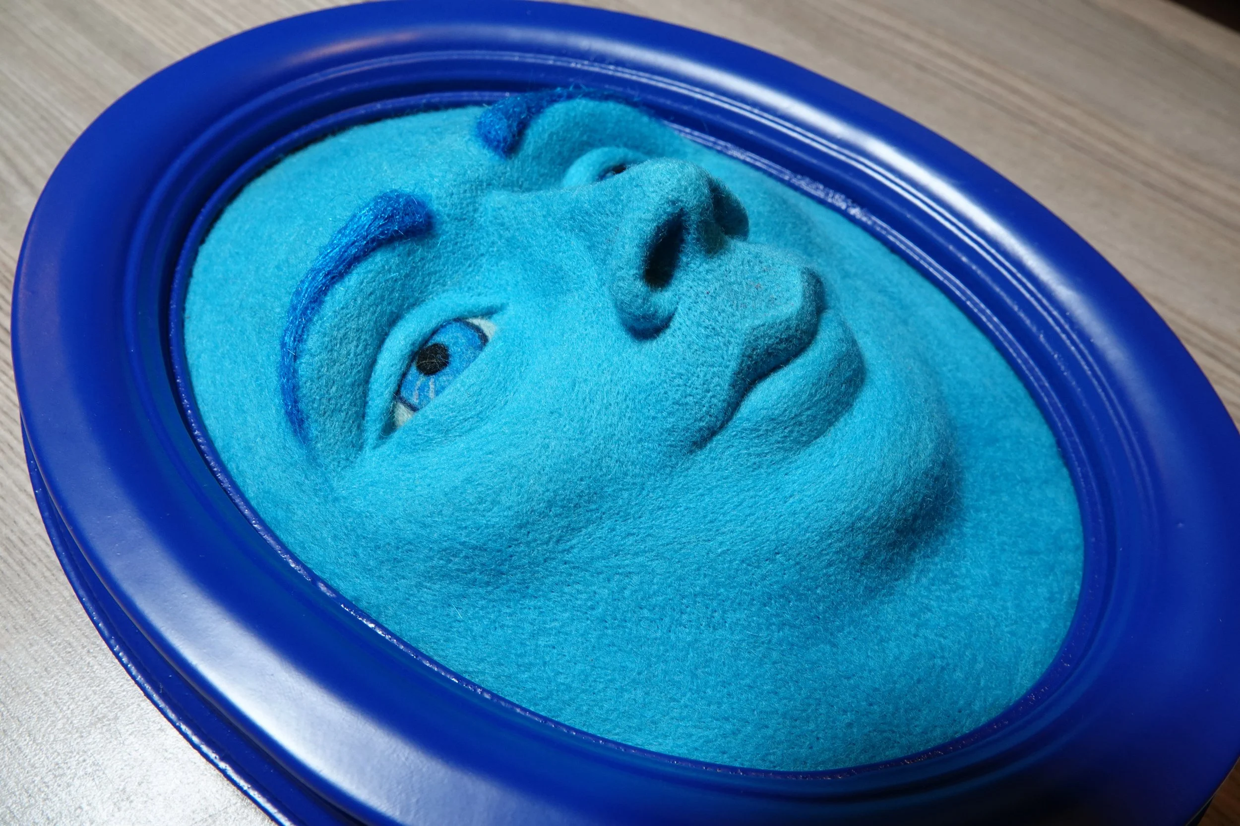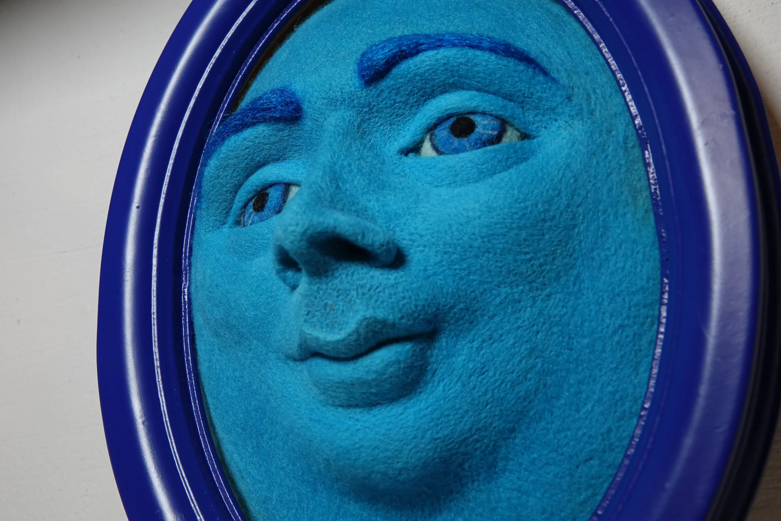 Oval frame 3d wall art, Realistic human face artwork, Needle felted soft sculpture, Contemporary blue home decor, Modern wool wall hanging